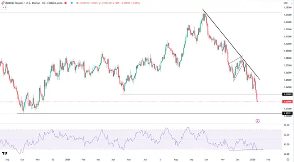 尽管RSI指标出现背离迹象暗示趋势反转,但在目前美元强势和英国债市动荡的情况下,英镑阻力最小的方向仍是下行,反弹做空是主要的考虑,空头的下一个目标为2023年10月低点1.2037。