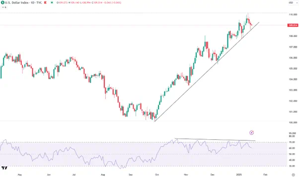 美元指数从9月末以来上涨近10%(下图),其背后有降息预期降温的推动,也有贸易战威胁的助力以及避险情绪的酝酿。若能守住上升趋势线,多头的下一个重要目标为2022年9月高点114.80,但图中的背离走势也不可忽视。
