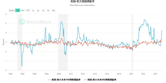 然而最令人担心的还不是已经出现回升迹象的通胀,而是特朗普的关税大战可能引发更大的通胀风险。密歇根大学的调查显示,美国1年期通胀预期升至4.3%,创2023年11月以来新高,5年期升至3.3%,为2008年以来最高水平。