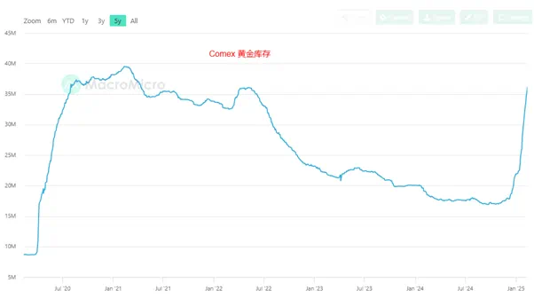 1月纽约黄金期货合约的交割量达到2.25万手即约225万盎司,远超同期水平。对实物交割的罕见热情导致纽约商品期货交易所(Comex)的黄金库存在过去两个月重现了疫情时期的增速(大部分都是从伦敦迁移过来的),当前库存超过3600万盎司。远超交割需求的库存增量是暗示未来还有更大的交割量吗?从目前的数据来看,至少2月的黄金交割量会较1月有大幅度的增加。