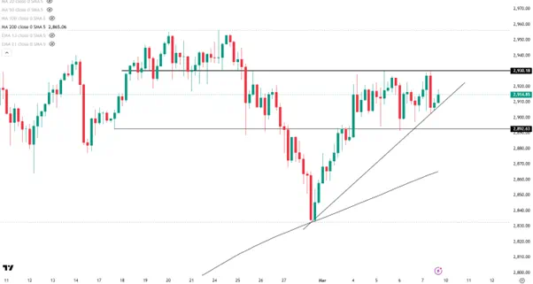 非农行情过后,黄金仍未脱离2890-2930的震荡区域,但是小幅上移的低点再次明确了金价的上行趋势。在本周CPI数据出炉之前,金价可能延续震荡行情并伺机挑战2930一线的阻力,突破后将冲刺历史高点。下行方向,首先关注短期趋势线2910附近。