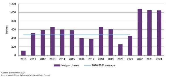 世界黄金协会的数据显示,2024年全球黄金需求到达4974吨创历史新高,其中全球央行购金量连续三年突破1000吨且四季度同比增长54%,贡献了2024年黄金需求增量的70%以上。而在特朗普2.0巨大的不确定性笼罩下,全球央行(尤其是新兴市场央行)对黄金的需求有望持续保持高位。