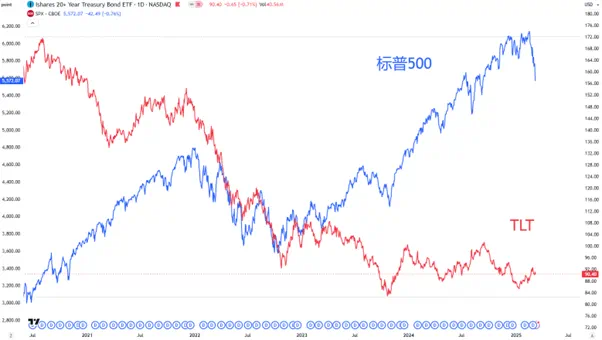 标普500 vs 20年期以上美国国债ETF(TLT) 来源:Traidingview