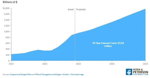 这一猜测有一定的合理性(但也有失控的危险),毕竟美国2024财年的关税收入才780多亿美元,仅占联邦财政收入的不到2%,可见增加关税对实现预算平衡来说是杯水车薪。而在去年近7万亿美元的财政支出中,净利息支出就高达8800亿美元,占总收入的18%成为第三大支出项。国会预算办公室预计2025年财年利息支出将升至9500亿美元,到2035年将到达1.8万亿美元。
