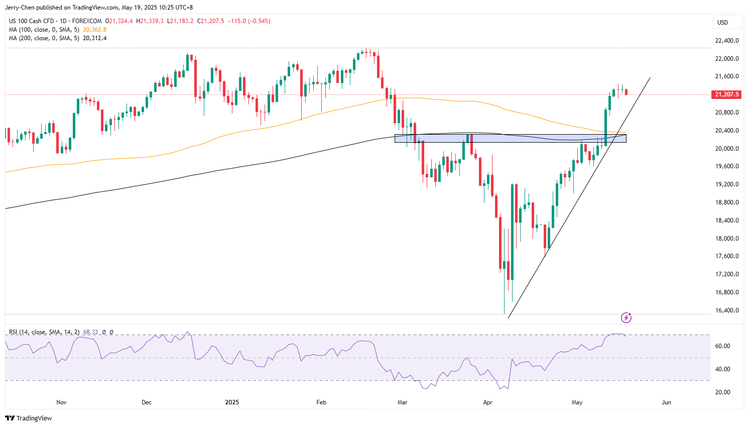 中美关税降温已经令纳斯达克100指数从4月低点反弹超过30%,这一程度超出了很多投资者的预期,况且经济现状、地缘局势,以及美债等问题远非高枕无忧,因此还是倾向于认为目前走势接近反弹的尾声。关注趋势线对指数的支撑,若跌破后恐考验均线附近20300一线的支撑。